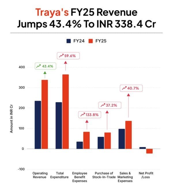 Traya’s operating revenue surged 43% YoY to INR 338.4 Cr in FY25, up from INR 236 Cr in FY24, driven by continued scale-up in product sales.